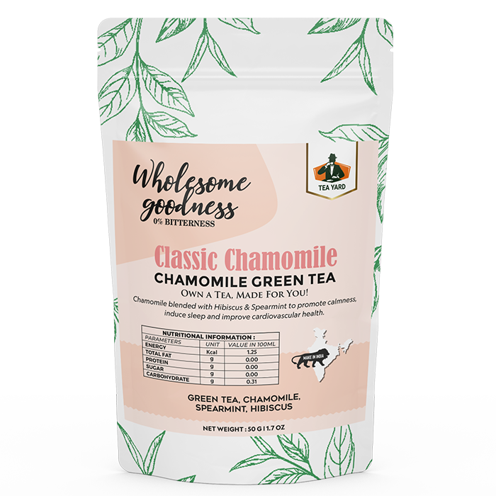 Tea Yard brings classic chamomile green tea enriched with hibiscus and spearmint to give you the best relaxing, calming & invigorating effect with every sip you take! It is the best green tea to have at night so you can sooth your senses for a relaxed sleep ahead. Our experienced & qualified team uses the potent combination of Green Tea, Chamomile, Spearmint & Hibiscus from around the valleys to prepare the revitalizing flavour in order to help you live an energetic life the natural way. Relish our green tea at anytime of the day.